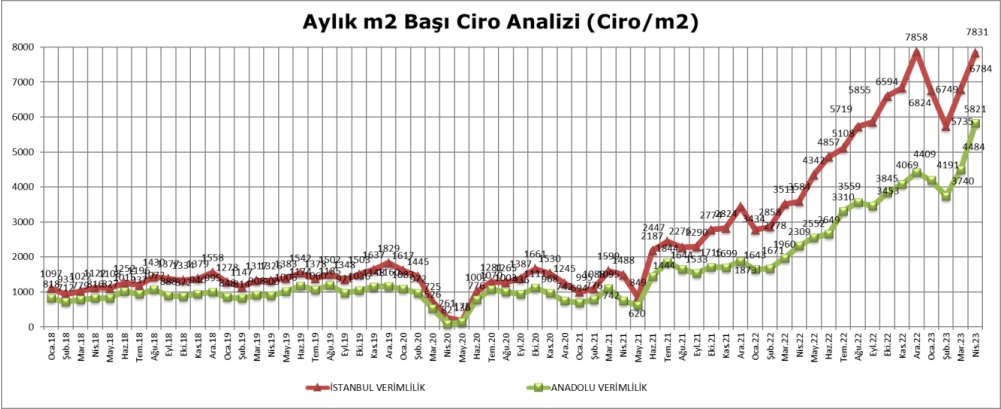 AVM’lerde kiralanabilir metrekare alanı başına düşen ciro Nisan ayında Türkiye genelinde 6.625 TL iken İstanbul’da 7.831 TL, Anadolu’da 5.821 TL olarak gerçekleşmiştir.