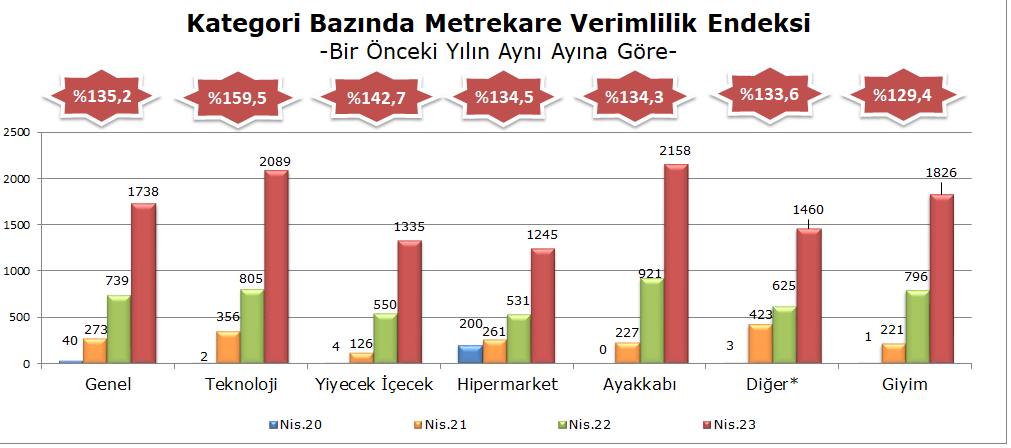 Endeks kategoriler bazında geçtiğimiz yılın Nisan ayı ile karşılaştırıldığında en büyük artış yüzde 159,5 ile teknoloji kategorisinde görülmüştür. Yiyecek-içecek kategorisinde yüzde 142,7, hipermarket kategorisinde yüzde 134,5, ayakkabı kategorisinde yüzde 134,3, diğer kategorisinde yüzde 133,6 ve giyim kategorisinde yüzde 129,4’lük bir artış yaşandığı görülmektedir.