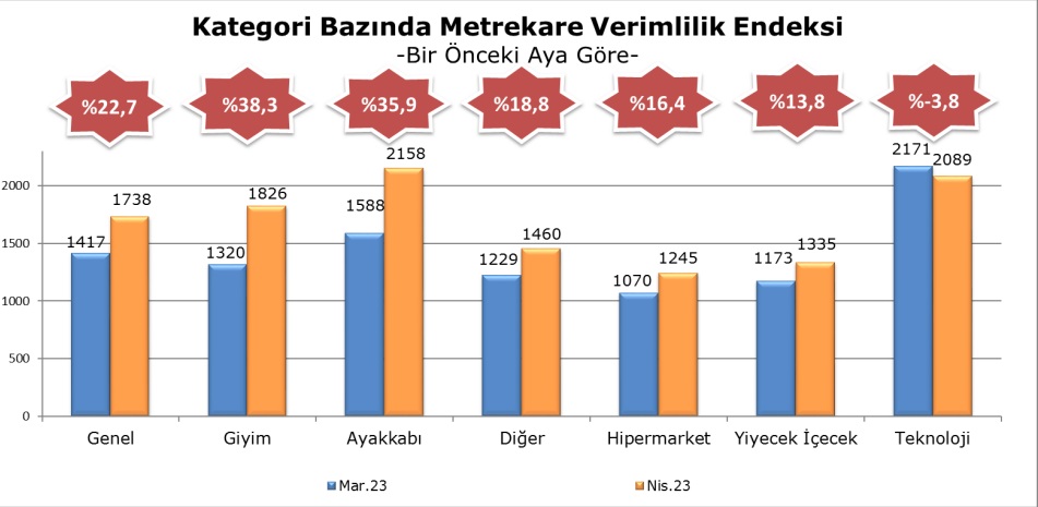 Kategori bazında ciro endeksi bir önceki ay olan Mart 2023 dönemi ile karşılaştırıldığında giyim kategorisinde yüzde 38,3, ayakkabı kategorisinde yüzde 35,9, diğer kategorisinde yüzde 18,8, hipermarket kategorisinde yüzde 16,4 ve yiyecek-içecek kategorisinde yüzde 13,8’lik bir artış yaşandığı görülmektedir.