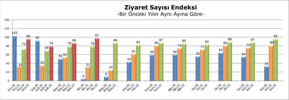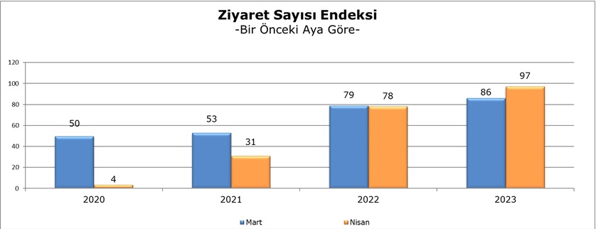Nisan 2023 verileri bir önceki yılın aynı ayı ile karşılaştırıldığında ziyaret sayısı endeksinde yüzde 24,3’lük bir artış ile 97 puana yükseldi.