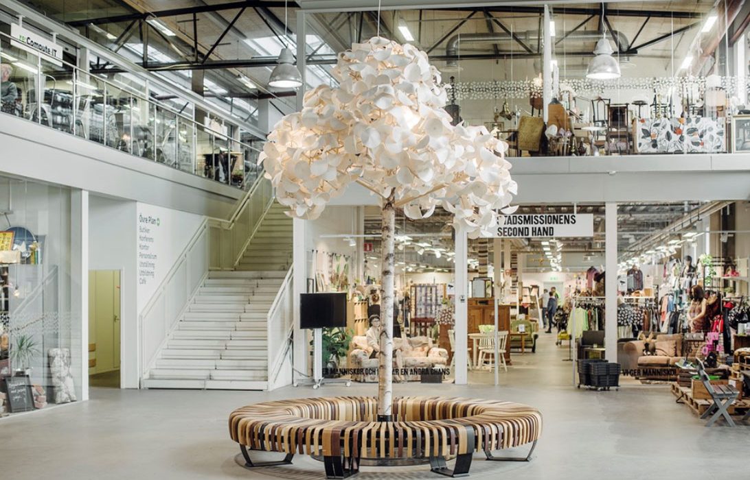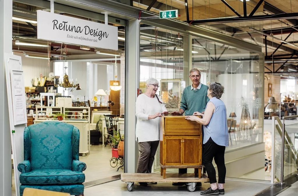İkinci el alışveriş için özel bir konseptle açılan AVM’de geleneksel bir belediye geri dönüşüm merkezi, bir alışveriş merkeziyle birleşiyor. İnsanlar bu AVM ziyaretlerinde artık ihtiyaç duymadıkları eşyaları bırakmanın yanında alışveriş yaparak bir kafede mola verebiliyor. ReTuna Återbruksgalleria, kendini “düşük karbonlu alışveriş devriminin başlangıcını işaret eden dünyanın ilk geri dönüşüm alışveriş merkezi” olarak tanımlıyor.