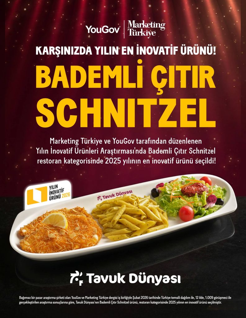 Türkiye’de fast-casual restoran deneyiminin öncülerinden Tavuk Dünyası, dünya mutfağından ilham alan lezzetleri kendi yorumuyla misafirleriyle buluşturmaya devam ediyor. Marka, özenle marine edilen tavuklarını dilimlenmiş badem ve çıtır kadayıf ile kaplayarak hazırladığı Bademli Çıtır Schnitzel ile Marketing Türkiye ve YouGov tarafından gerçekleştirilen “Yılın İnovatif Ürünleri” araştırmasında tüketici değerlendirmeleri sonucunda restoran kategorisinde birinci seçildi.